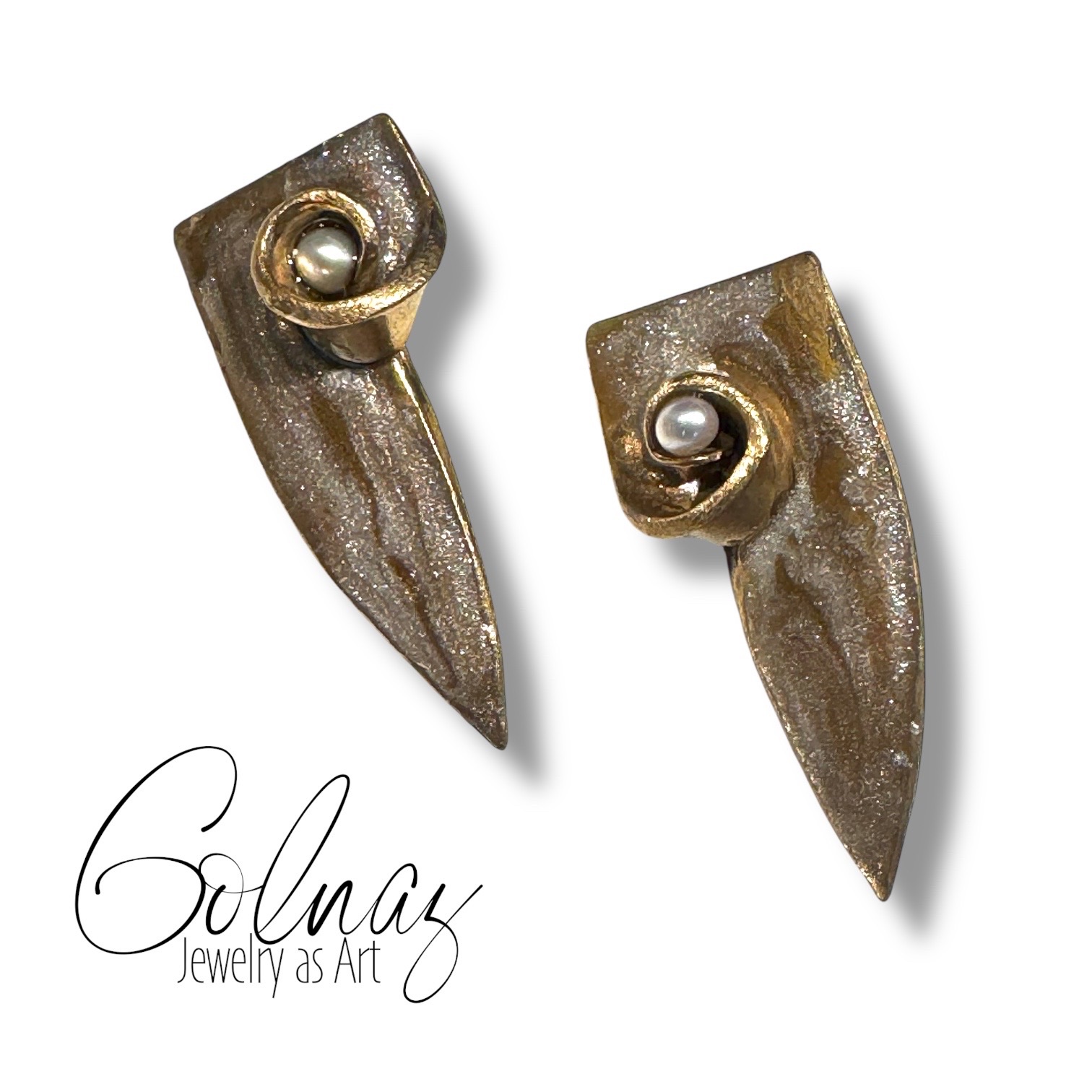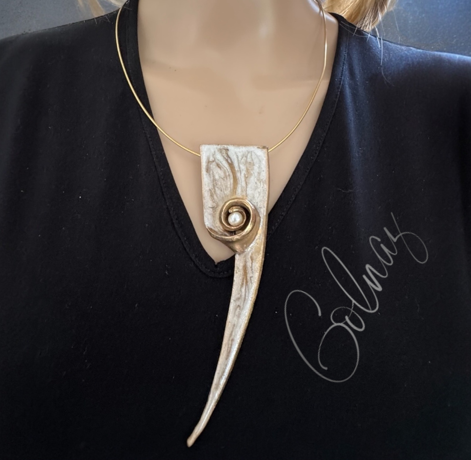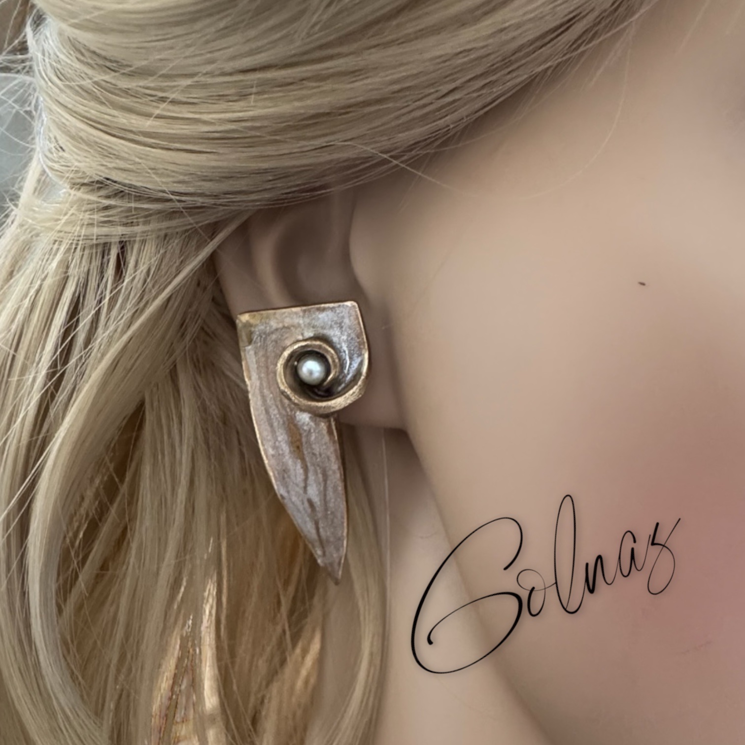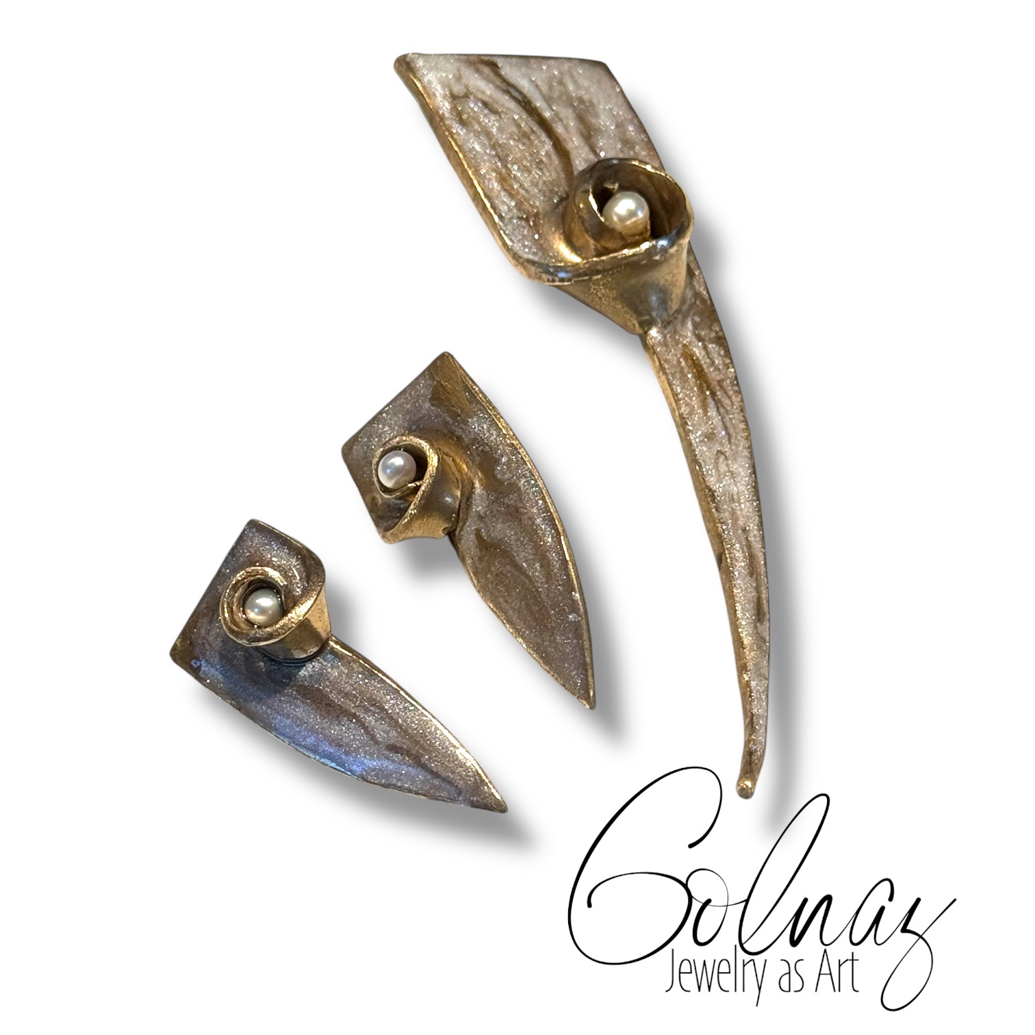 Unique designed pendant with a freshwater pearl including a goldplated silver omega chain. + a set of matching earrings. (Can be purchased without earrings).